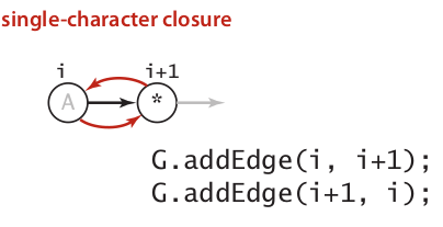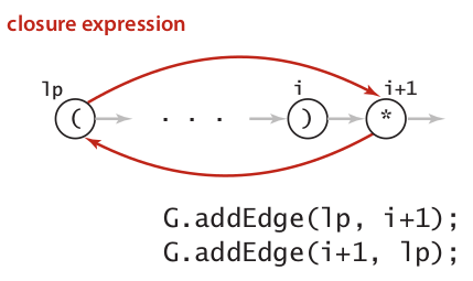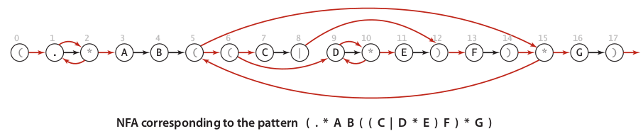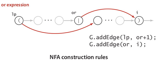 Building an NFA corresponding to an RE is similar to constructing arithmetic expression using Djikstra’s two-stack algorithm. The differences to Djikstra are: